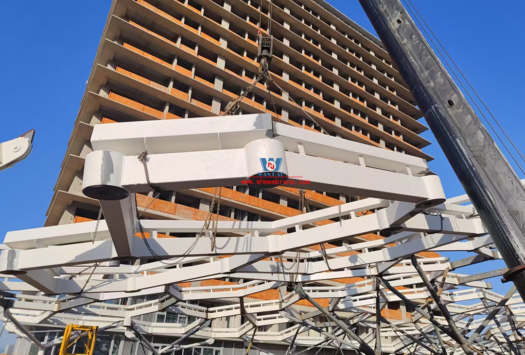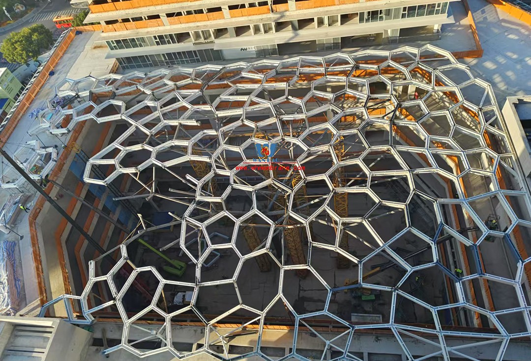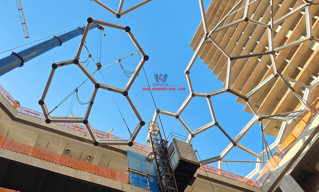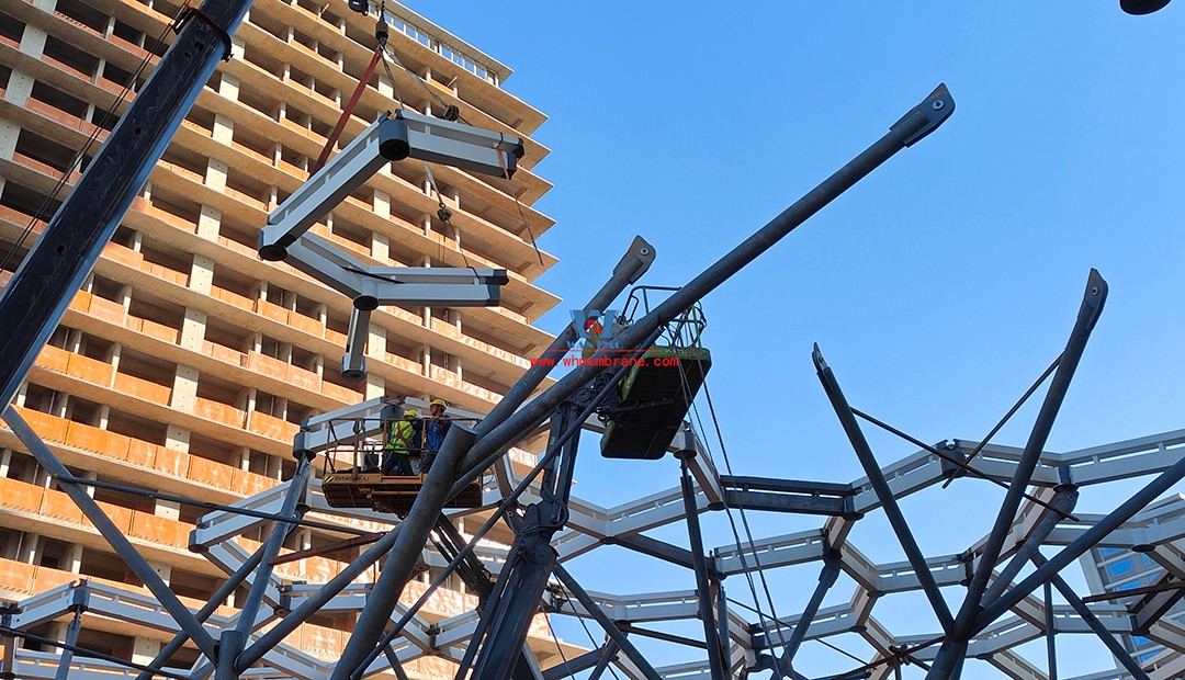 The new urban interface is inseparable from the high-level "cover" presentation, creating a modern aesthetic temperament of the architectural structure, from the film selection of the ceiling, line design, to meticulous construction, all highlight the aesthetic tone and ingenuity of Wanhao quality. After the completion of the project, the interior can provide all-weather integrated facilities, which can meet the needs of the elderly group's culture and art, training, entertainment, accommodation, catering and other life needs, transparent ETFE film material, so that life is also full of dreamlike color. At this stage, the splicing, welding and painting of the steel structure are being carried out, and the overall modeling framework has been initially formed. Wanhao construction personnel are steadily pushing forward the project progress in accordance with the node requirements, and they are about to enter the membrane tensioning work.