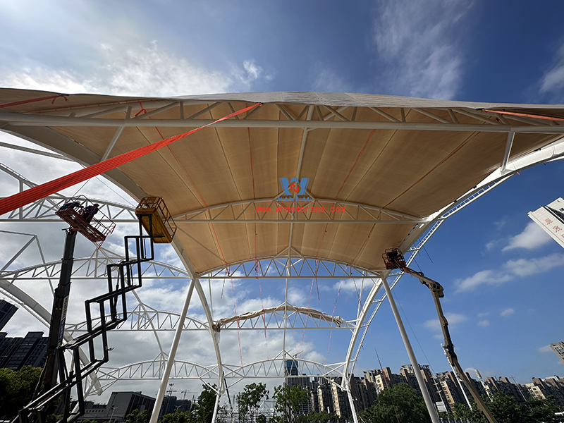 Wenzhou Huimin Road west green stadium steel film structure project, the total amount of steel used in the project is about 310 tons, PTFE film structure expansion area of about 7760 square meters.